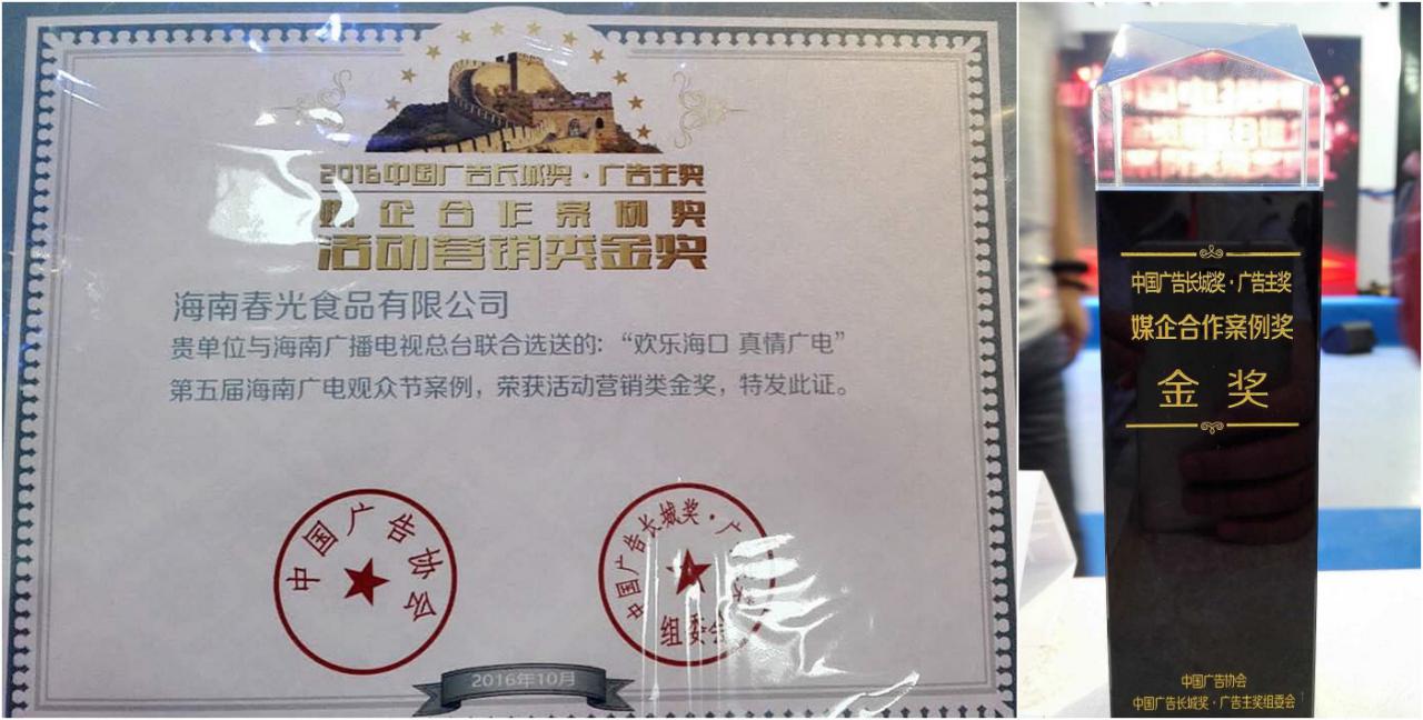 “媒企合作案例獎(jiǎng)”隸屬于中國廣告業(yè)界最有影響力的獎(jiǎng)項(xiàng)“中國廣告長(zhǎng)城獎(jiǎng)?廣告主獎(jiǎng)”,是由中國廣告協(xié)會(huì)主辦的國家級(jí)大獎(jiǎng),旨在表彰推動(dòng)中國媒體廣告行業(yè)發(fā)展的、具有媒體企業(yè)融合共贏代表性的優(yōu)秀案例。春光食品攜手海南廣電打造的——“歡樂海口 真情廣電”第五屆海南廣電觀眾節(jié)案例獲獎(jiǎng),體現(xiàn)了中國廣告行業(yè)對(duì)春光品牌的認(rèn)可,也彰顯了該品牌的傳播價(jià)值。