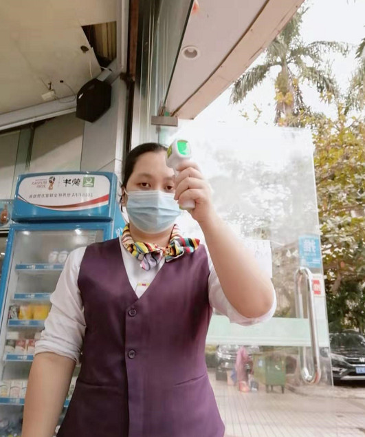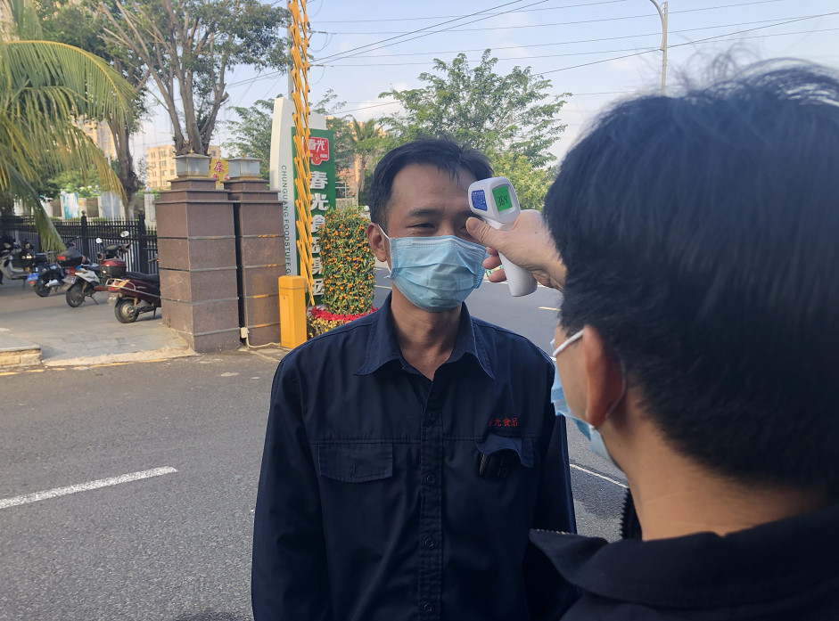在總公司,每天對(duì)辦公地點(diǎn)進(jìn)行全面消毒,對(duì)出入員工進(jìn)行體溫測(cè)量。